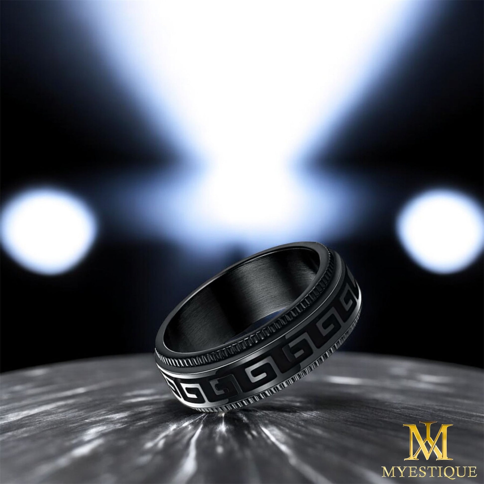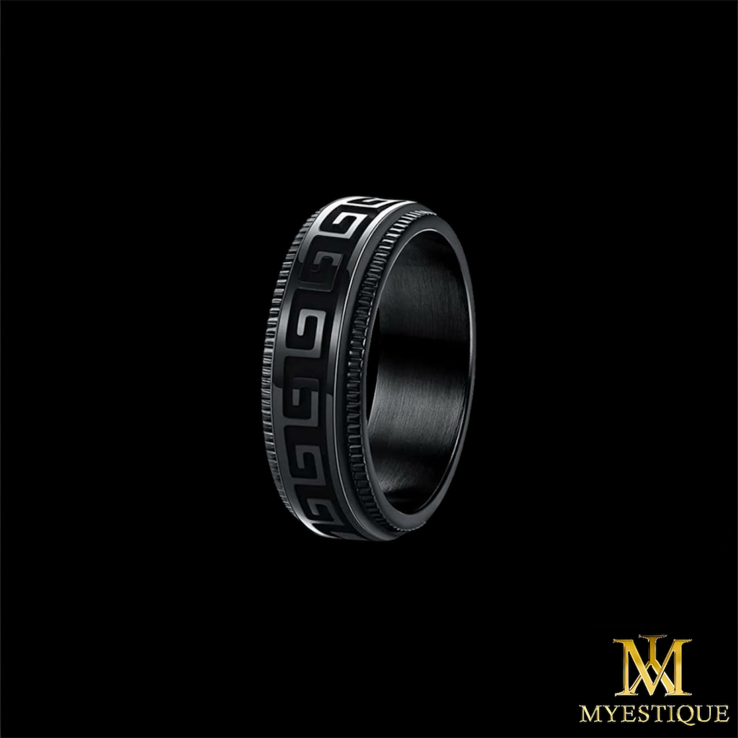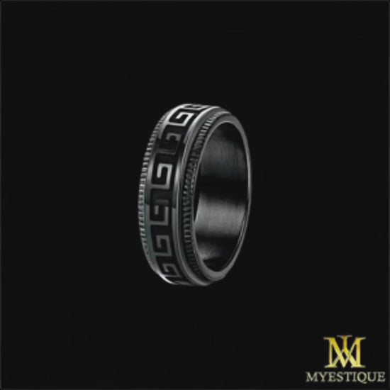 Unser „Myestique Eterna“ Ring ist eine faszinierende Kreation der Myestique-Kollektion, präzise gefertigt aus fortschrittlichem Titanstahl. Dieser Ring besticht durch ein einzigartiges Feature: Ein sich drehendes zentrales Band, das kunstvoll mit einem griechischen Mäander-ähnlichen Muster versehen ist, bietet nicht nur visuellen Genuss, sondern verleiht ihm auch eine spielerische Interaktivität. Die schwarze Oberfläche bildet einen markanten Kontrast zum metallischen Glanz des beweglichen Elements und macht ihn zu einem modernen Accessoire mit antikem Charme. Perfekt für den modernen Träger, vereint der „Myestique Eterna“ zeitgemäße Technik mit klassischem Design.